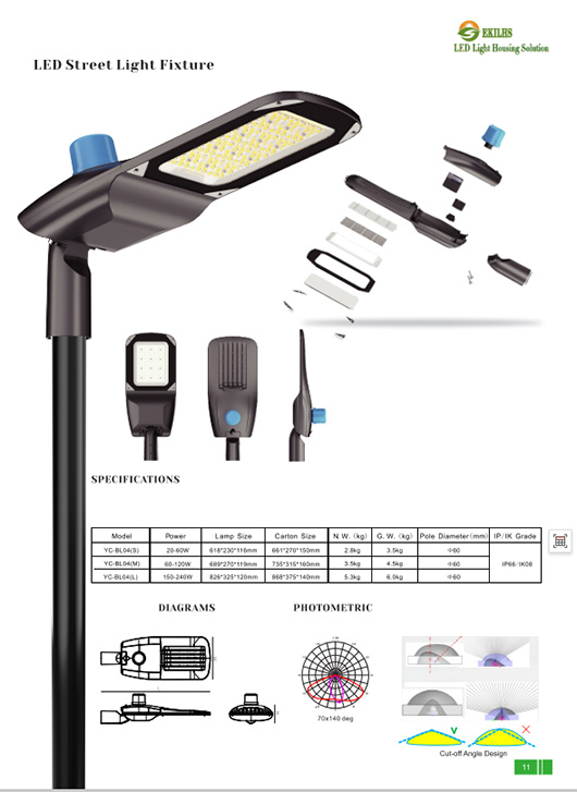 | EK-BL04(S) | 618*230*116 | 20w-80w (stĺpik lampy 60mm) | Hliníkové puzdro, tvrdené sklo, gumený krúžok, skrutky |